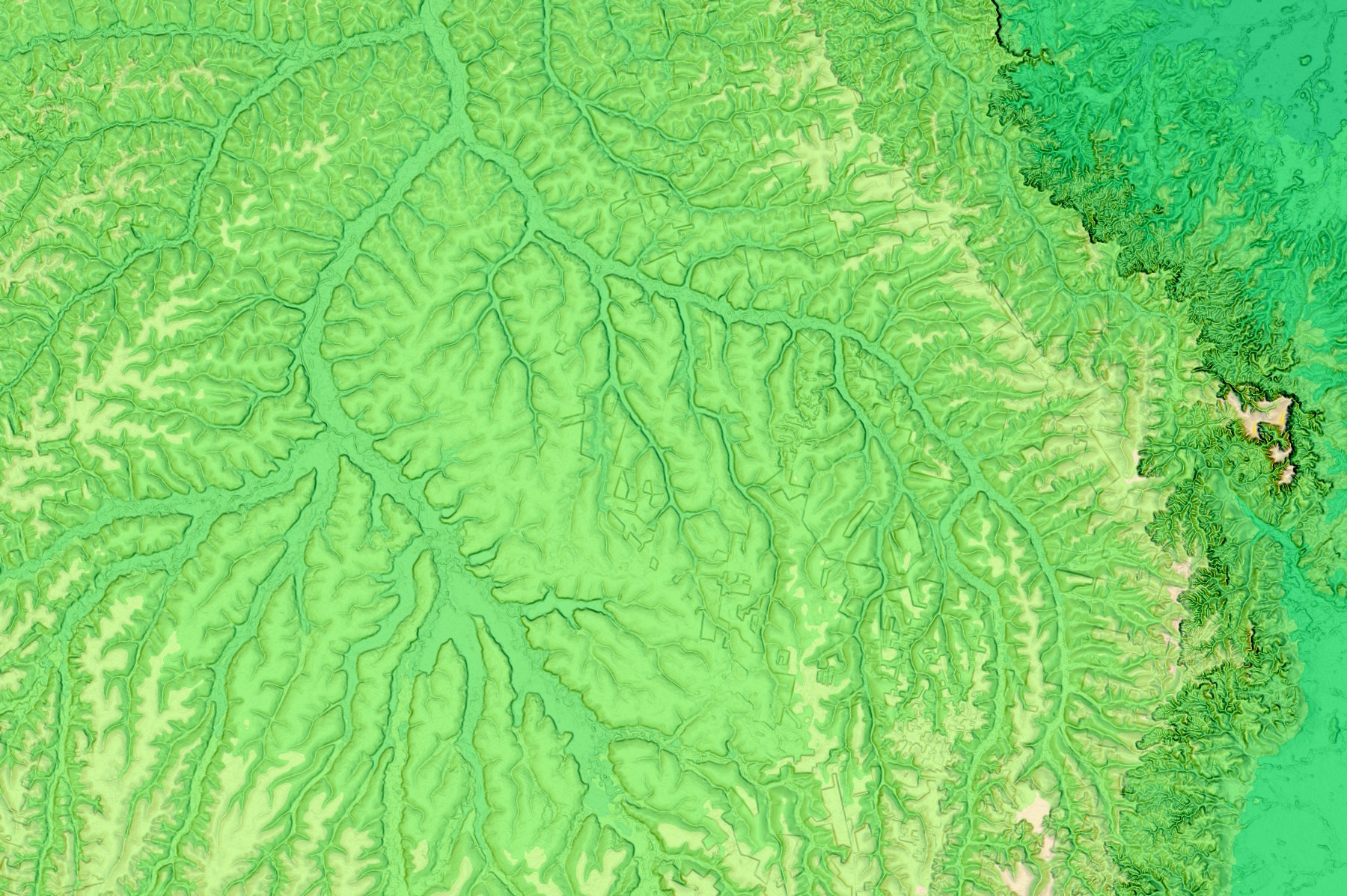 Feine Verästelungen und Verzweigungen. Farbige Höhenschichten. Im brasilianischen Tiefland gibt typischerweise es nur einige Dutzend Meter aufweisende Höhenunterschiede. Eine leichten Böschungsschummerung arbeitet die Flussverästelungen wunderbar heraus.