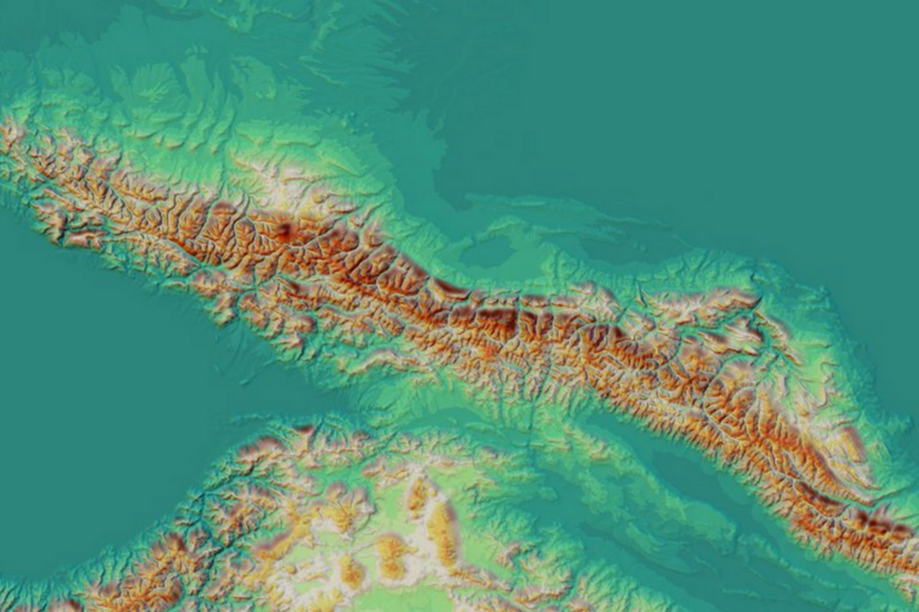 Farb-Kombinationsschummerung und farbige Höhenschichten. Experimentalversion, bei der die üblichen Brauntöne der Hochgebirgslagen sehr weit nach oben gezogen worden sind. Dadurch kommt die Gebirgsstruktur sehr schön zum Ausdruck.