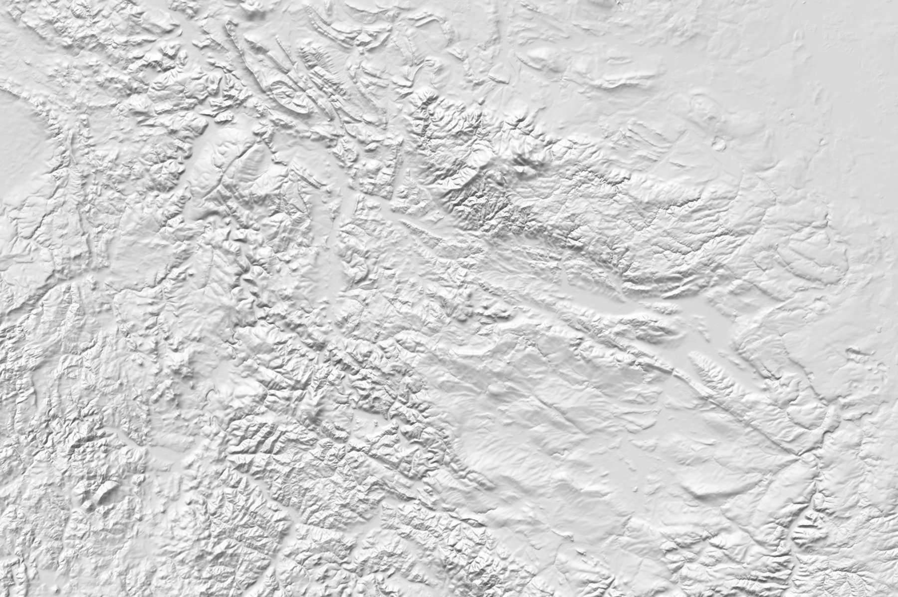 Eine Lambert-Schräglichtschummerung mit niedriger Lichthöhe. Eine ganz sachliche Beleuchtungssimulation, in die kaum gestaltend eingegriffen wurde. Die Darstellung gewinnt ihren Reiz aus der Vielfalt des modellierten Formenschatzes in der Natur.