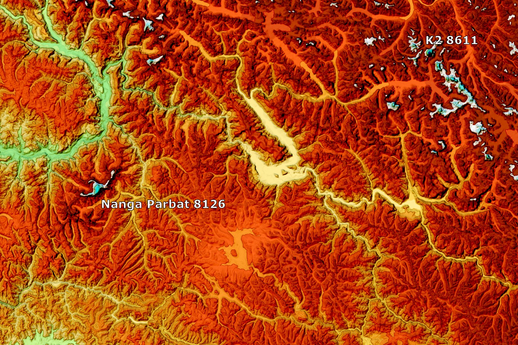 Ungewöhnlich: Höhen über 6000 Meter sind weiß, über 7000 Meter hellblau, über 8000 Meter tiefblau angelegt (Letzteres ist am K2 sichtbar). Dies bewahrt die Brauntöne vor Überdehnung.