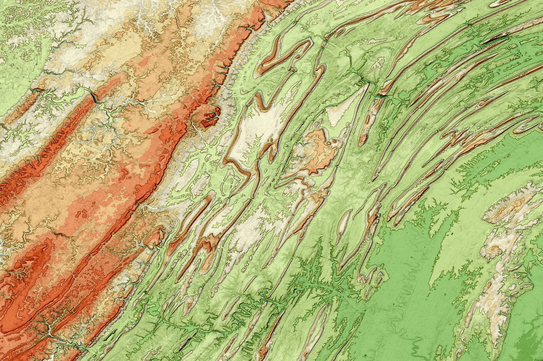 Pennsylvania, etwas östlich von Pittsburgh: Überraschende Reliefstrukturen, die sich doch erheblich von unseren gewohnten Mittel- und Hochgebirgsformen unterscheiden.