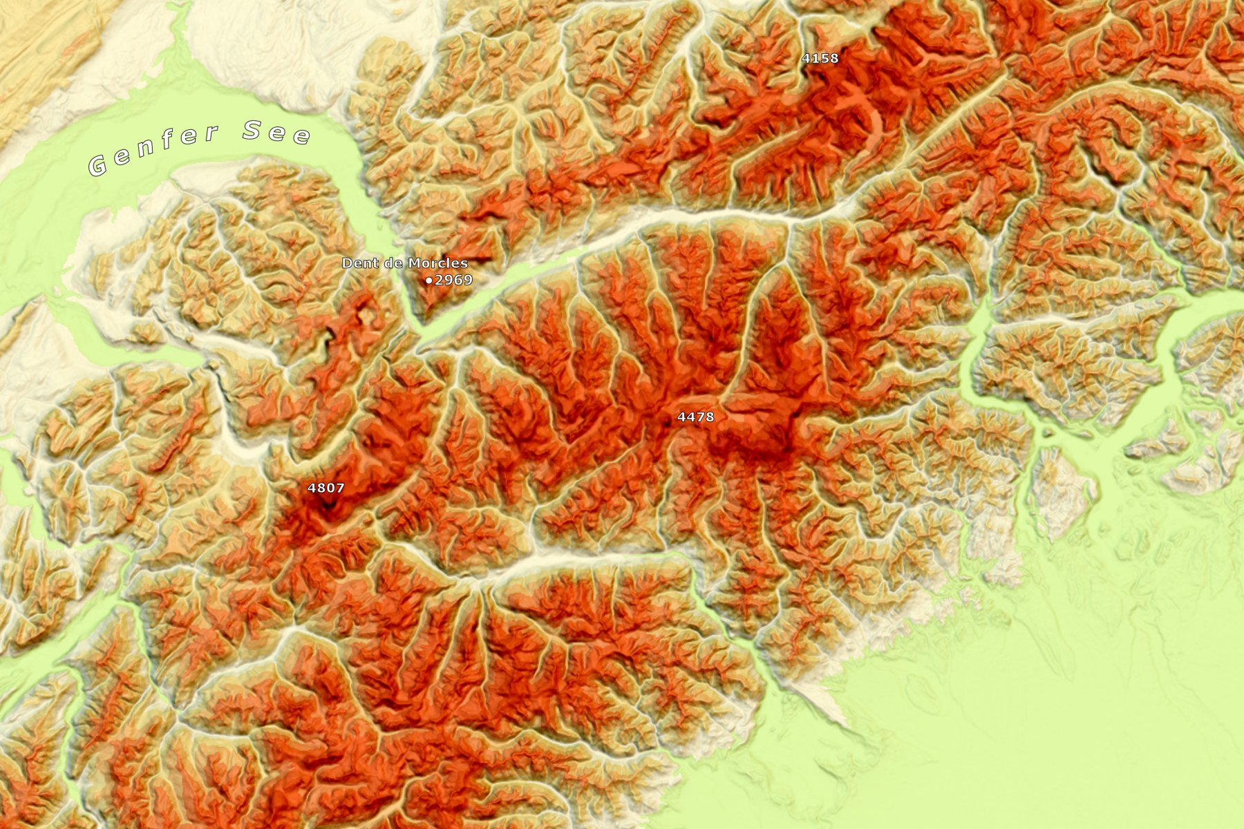 Die höchsten Massive der Alpen - seit Vogels Karte von Mitteleuropa klassischer Prüfstein für Reliefdarstellungen. Jungfrau, Matterhorn und Mont Blanc. Der Dent de Morcles kann da mit seinen 2969 Metern höhenmäßig nicht mithalten, symbolisiert aber eine kartographiegeschichtlich Landmarke: Es dies der erste Berg, von dem eine analytische Schummerung erstellt wurde - 1973 von Kurt Brassel in Zürich.