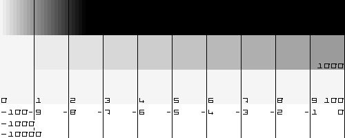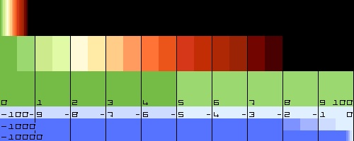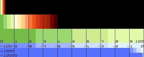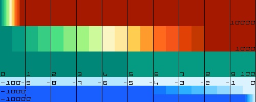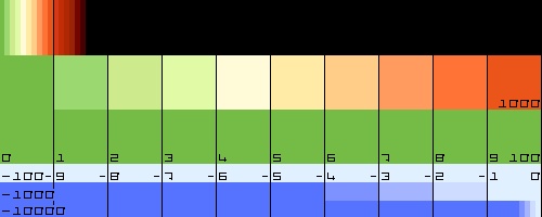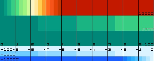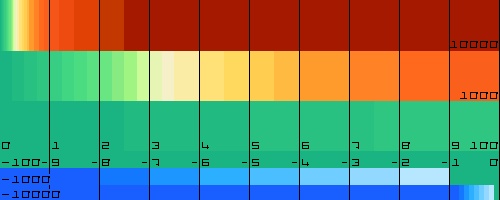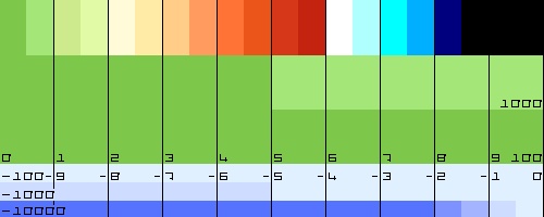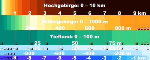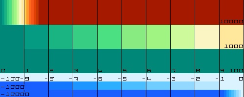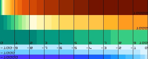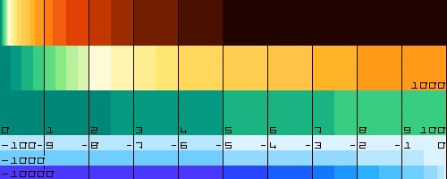 Hier eine Reihe bereits vorgefertigter Höhenskalendateien. Der Aufbau der Dateien ist hier beschrieben. Die Testbilder enthalten in 6 verschiedenen Skalen alle Höhen von -10000 bis +10000 Metern. Die Skalen enthalten je Gebirgshöhen und Meerestiefen mit je 100, 1000 und 10000 Meten Skalenlänge: