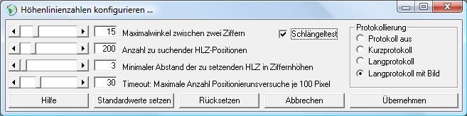 Mit dem Fenster Höhenlinien/Höhenlinienzahlen konfigurieren werden die die Suche von Höhenlinienzahlen steuernden Parameter eingestellt.