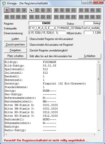 Vimage-intern werden Bilddaten in 32 Bildregistern gespeichert. Die Registerschalttafel (Extras/Registerschalttafel) ist der Schlüssel zu den Bildregistern, also gewissermaßen das Herz von Vimage.
