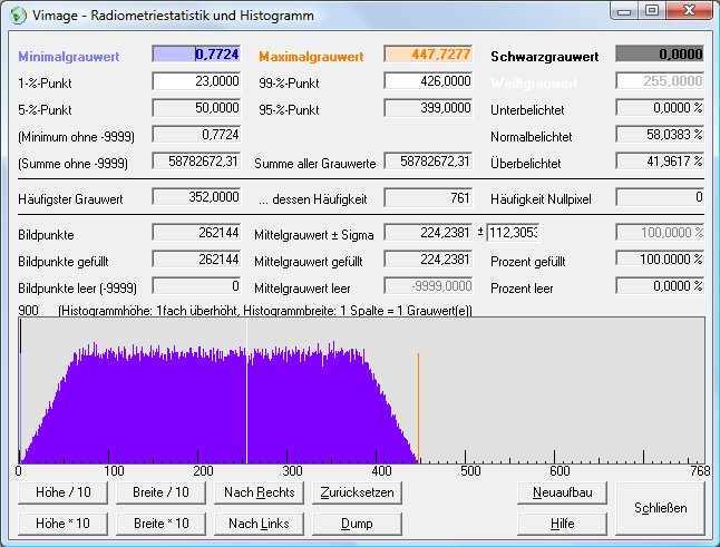 Im Statistikfenster (Radiometrie/Statistik und Histogramm) werden die Ergebnisse statistischer Bildanalysen dargestellt.