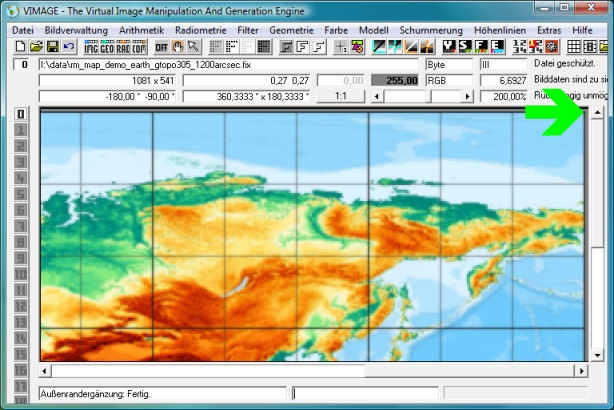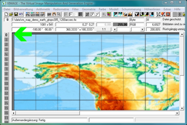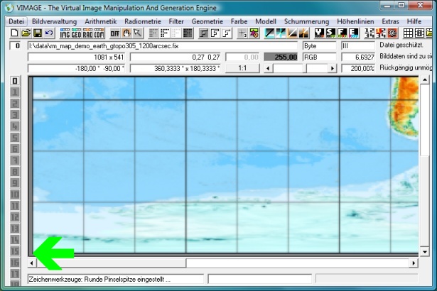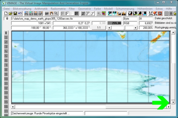 Wenn das Zeigerwerkzeug aktiv ist, so werden, wenn man mit der Maus über das Bild fährt, unten, im Mitteilungsfenster