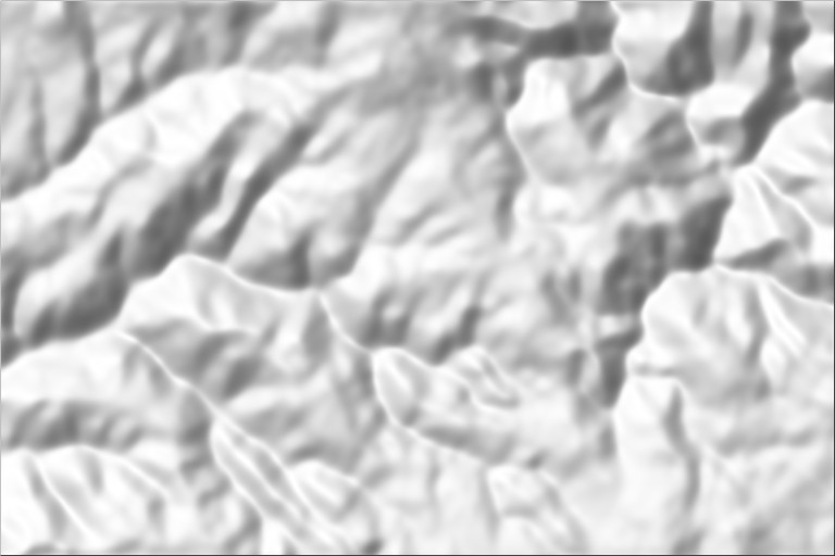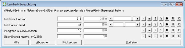 Schließlich ein Versuch, der eine sehr schöne Schräglichtschummerung herstellt. Das Höhenmodell mit der Menüfunktion Schummerung/Lambert-Beleuchtung bearbeiten. Auch hier erscheint wieder das bekannte Dialogfenster mit den 4 Parametern. Hier bitte die vorgegebenen Werte auf 315, 45, 10 und 3 ändern: