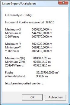 - Liste XYZ importieren (dateigepuffert) ist eine recht schnelle Funktion für sehr große Dateien. Mit dem dateigepufferten Import lassen sich Höhenmodelle mit bis zu etwa 200 Millionen Höhenpunkten importieren. Für kleine Dateien ist der dateigepufferte Import allerdings nicht zu empfehlen, denn die Funktion verbraucht einige Zeit, um den Dateispeicher bereitzustellen.