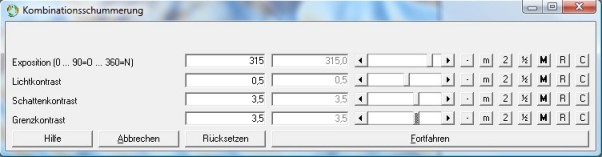 Nun die Kombinationsschummerung per Schummerung/Kombinationsschummerung rufen. Dabei zunächst das Parameter-Dialogfenster mit den Standardwerten 315, 0, 2 und 2 einfach wegklicken: