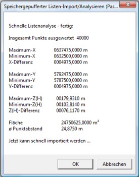 Wir nutzen die Funktion Liste XYZ importieren (speichergepuffert). Die Datei wird vermessen und nach wenigen Sekunden erscheint ein Statistikfenster: