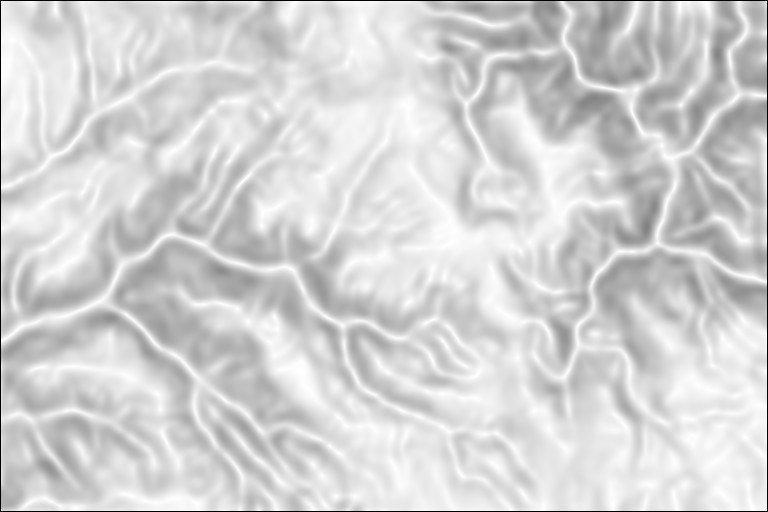 Deren zu starke Deckung kann nun eine Gammakorrektur Radiometrie/Gammatransformation mit Gammawert 2,5 wirksam beseitigen. Es entsteht die gewünschte Darstellung, die Areale stärkerer Hangneigung betonen, stützen und herausarbeiten wird: