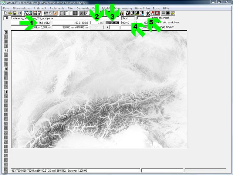 - Pfeil 3: Der Schwarzgrauwert ist 5000. Das ist ein für die Alpen, die bis Höhe 4800 reichen, ein brauchbarer Wert.