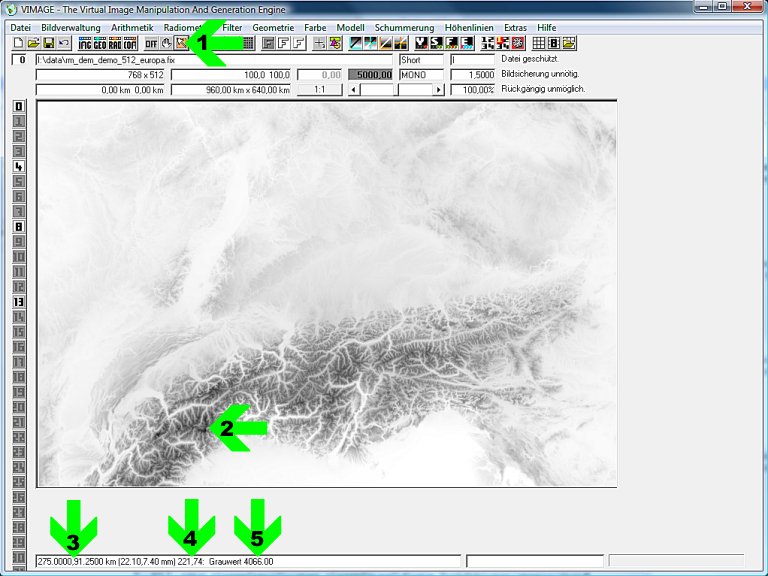 - Pfeil 5 zeigt den Grauwert des Pixels an. Das ist in unserem Höhenmodell die Höhe. Wir befinden uns in Höhe 4066 m.