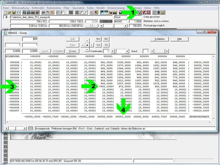 Die „1234-Schaltfläche“ (Pfeil 1) ruft das Dump-Werkzeug, das einen Einblick in die Bilddaten erlaubt. Standardmäßig wird die linke untere Bildecke angefahren. Hier sieht man: