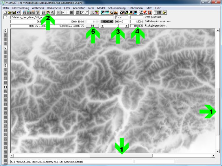 Am Anfang braucht man immer ein Rasterbild. Hierfür kann z. B. das Höhenmodell rm_dem_demo_512_europa.fix heruntergeloaden werden. Anschließend erfolgt das Einlesen in Vimage mit der Menüfunktion Datei/Öffnen ...