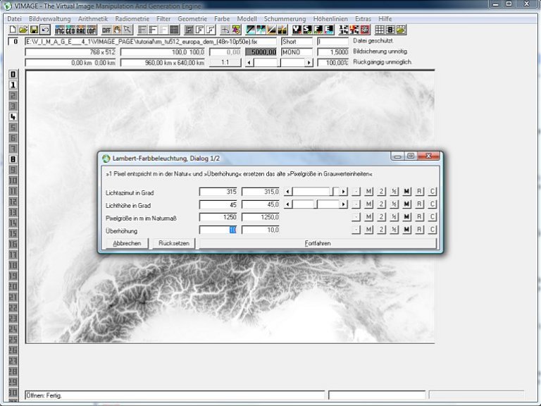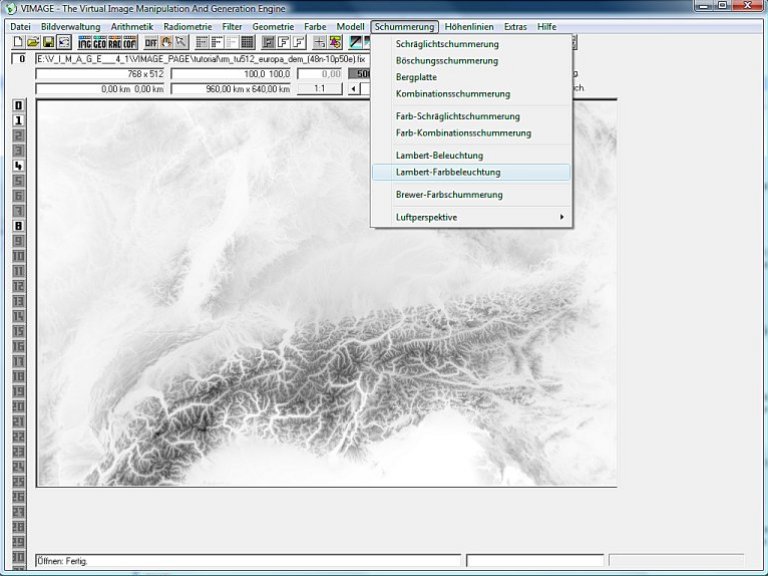 Wir beginnen mit dem Laden des Höhenmodells rm_dem_demo_512_europa.fix und lesen dies per Datei/Öffnen in Vimage ein: