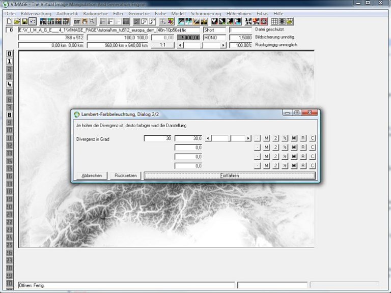 5. eine Divergenz in Grad abgefragt. Dies ist ein für alle Farbschummerungen charakteristischer Wert, die die Stärke der Farbigkeit maßgeblich beeinflusst. Divergenz Null führt zu monochromatisch schwarz-weißen Schummerungen. Hohe Werte erzeugen sehr bunte Darstellungen. Wir behalten den Wert -30°, also negativ, bei ...