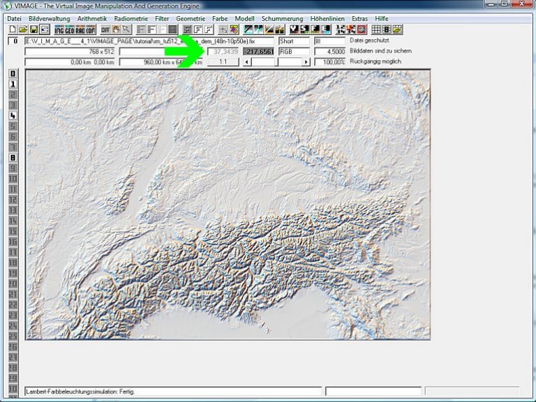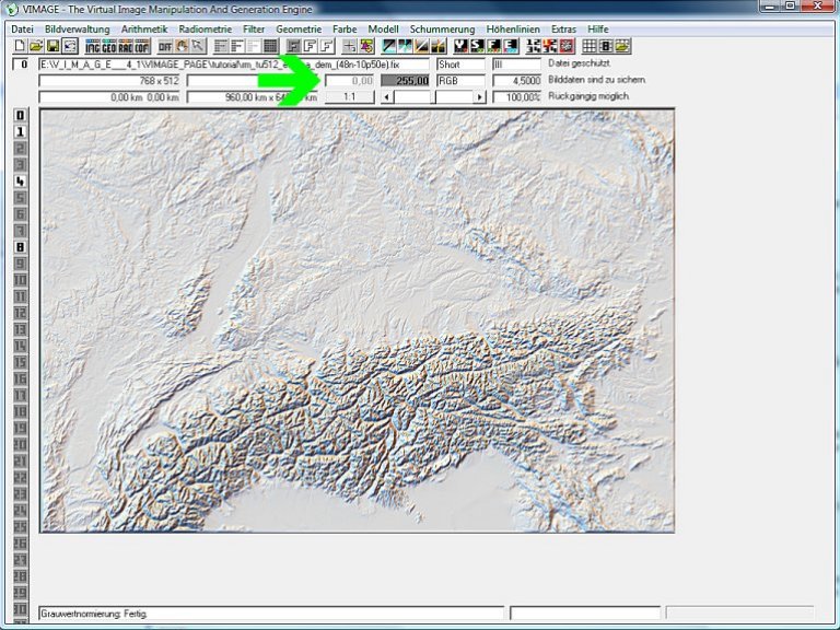 Das ist nicht immer gewünscht. Die ursprüngliche („native“) Schummerung kann ebenfalls erzeugt werden, indem man nämlich die Überhöhung negativ eingibt. Das bedeutet nun allerdings, dass weiß und schwarz „unrunde“ Werte erhalten. In unserem Fall liegt weiß auf Grauwert +37,34 und schwarz auf Grauwertt -217,65 (grüner Pfeil).