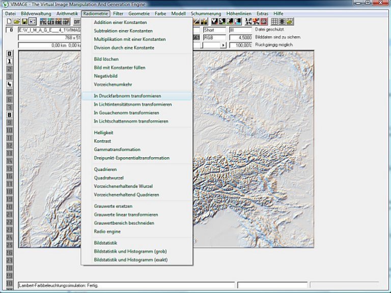 Eine Umwandlung der nativen Schummerung in Druckfarbnorm erfolgt mit der Menüfunktion Radiometrie/In Druckfarbnorm transformieren: