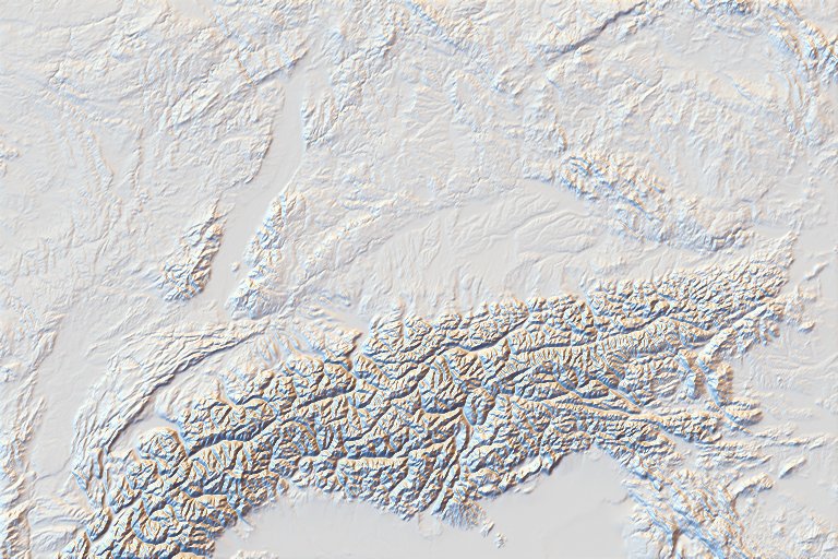Mit der Lambert-Farbschummerung lassen sich äußerst eindrucksvolle Hochgebirgsdarstellungen erzeugen. Der hellgraue Ebenenton wird aber auch oft als Kartenbelastung empfunden.