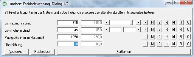 1. Das Lichtazimut in Grad. Lichtazimut bedeutet svw. Horizontalwinkel. Die Richtungen laufen von Nord = 0° im Uhrzeigersinn bis 360°. Wir wählen eine Beleuchtung aus Nordwerten, also 315°. Dies ist bereits der vorgegebene Wert 315.