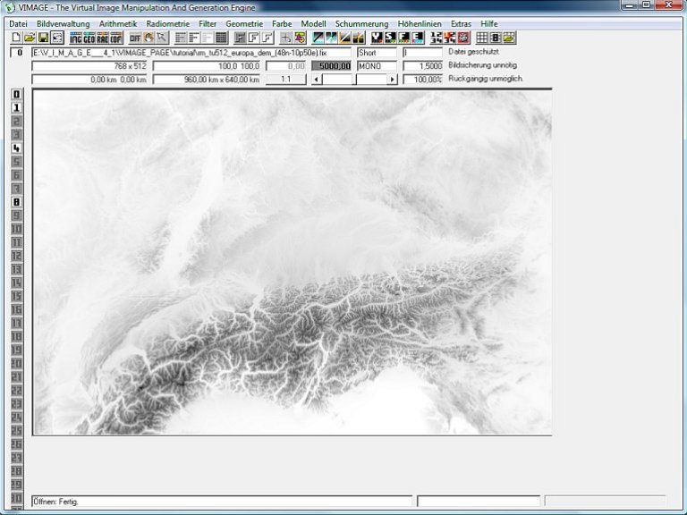 Wir beginnen mit dem Laden des Höhenmodells rm_dem_demo_512_europa.fix und lesen dies per Datei/Öffnen in Vimage ein:
