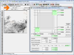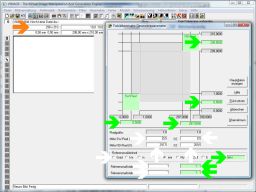 Die grünen Felder (grüne Pfeile) sind Felder, in denen die Steuerparameter angezeigt werden. In die weißen Felder (weiße Pfeile) können Eingaben erfolgen. Außerdem sollte man die Bildgröße (orangefarbener Pfeil) im Hinterkopf haben.