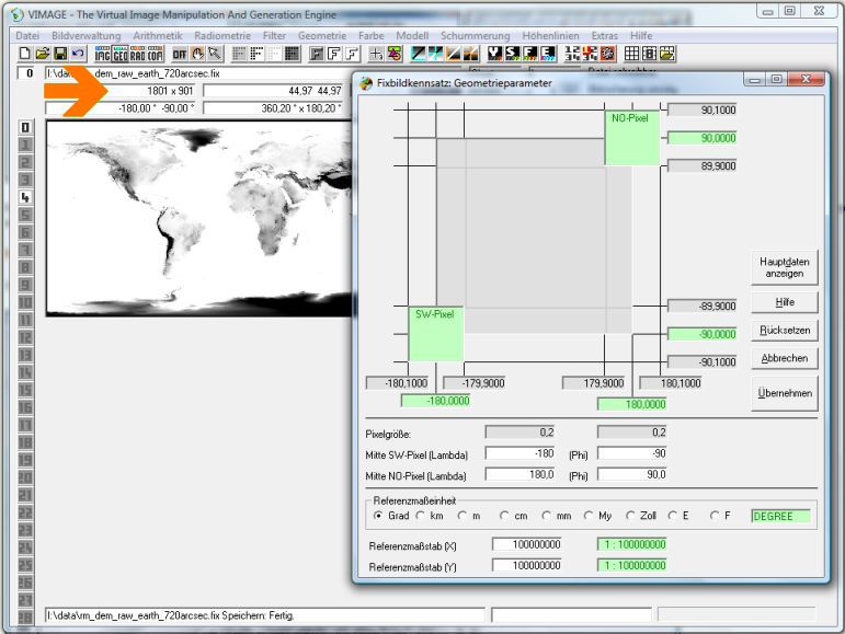 (Anmerkung: Die letzten 3 Parameter sind weniger bedeutsam. Im Zweifelsfall sind hier unkorrekte Werte hinnehmbar. Es kann dann zu unkorrekten Überhöhungen/Pixelgrößen bei der Lambert-Schummerung und falsche Auflösungen bei Exporten kommen.)