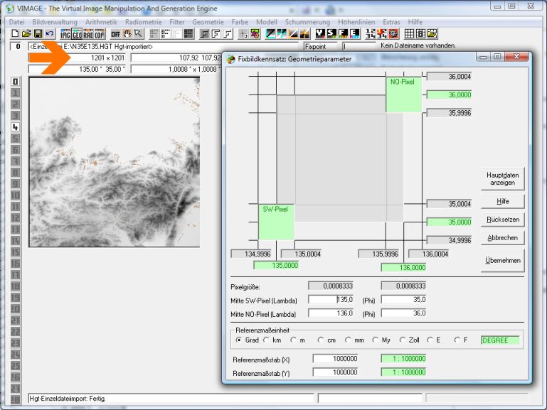 - Die Pixelgröße beträgt 0,000833 oder 1/1200 [Grad]. Das sind genau die SRTM-typischen 3 Bogensekunden (3 Arcsec).