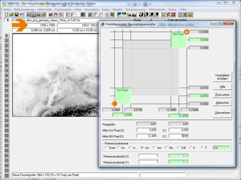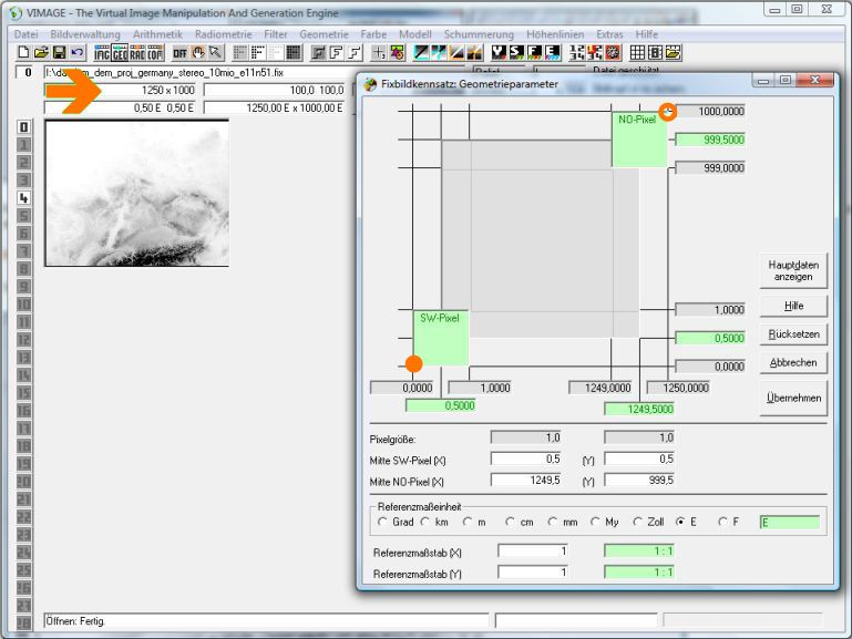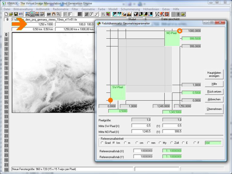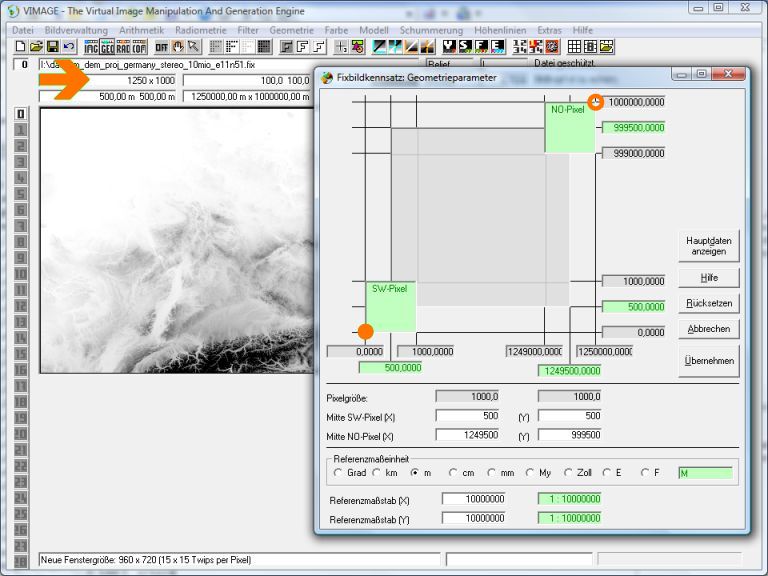 - Die Koordinate der Nordostecke des Nordostpixels (Ring) gibt wieder die Modellgröße an: Diesmal aber 1250/1000 [E].