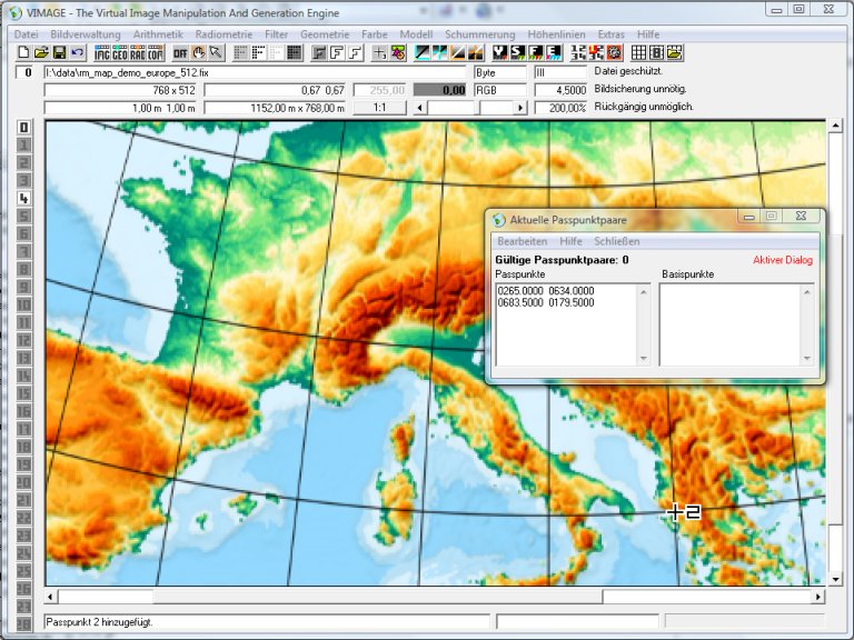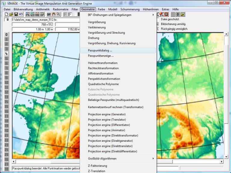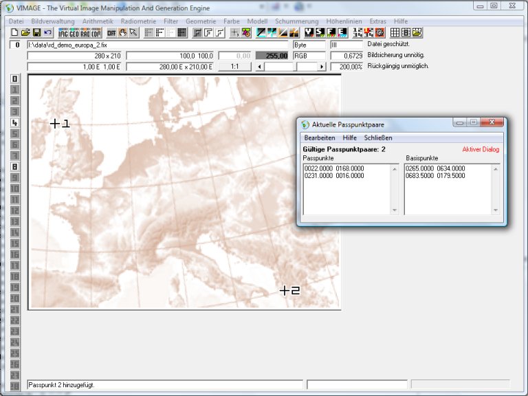 Wenn ein Punkt einmal versehentlich falsch gesetzt wurde, lässt er sich mit der Maus auch „anfassen“ und verschieben. Außerdem gibt es Menufunktionen zum Punkte löschen, speichern etc. Nachdem alle Punkte eingegeben worden sind, betätige man die Passpunktmenüfunktion Schließen. Ein Speichern der Passpunkte ist nicht erforderlich. Vimage merkt sich die Passpunktpaare im Hauptspeicher „im Hintergrund“.