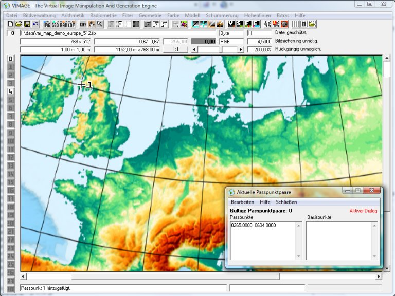 Nun wird ein zweites Mal per Geometrie/Passpunktdialog das Passpunktdialogfenster geöffnet. Die beiden alten „Basispunkte“ stehen unverändert auf der rechten Seite des Fensters. Nun können die beiden Punkte (in Schottland und Albanien) im einzupassenden Bild angeklickt werden: