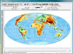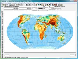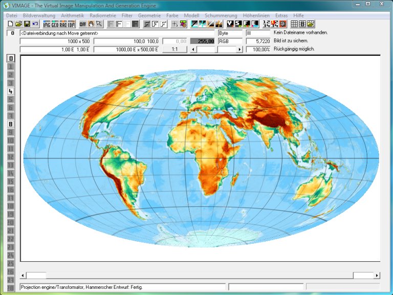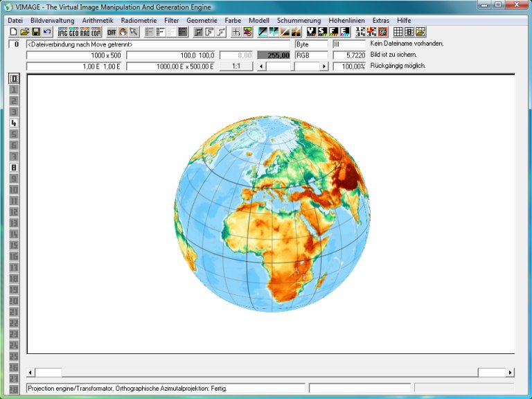 Am Anfang benötigt man ein im Gradnetz der Erde referenziertes Kartenbild oder Höhenmodell, z. B. die Erdkarte /data/rm_map_demo_earth_gtopo305_1200arcsec.fix (Etwa 1,7 MByte). Bitte herunterladen und in Vimage einlesen: