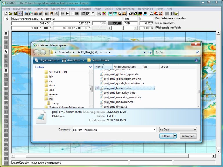 Nun rufen wir mit der Menüfunktion Geometrie/Kartennetzentwurf rechnen (Transformator) die Projection engine Transformator. Der Transformator fragt zunächst nach dem RT-Assemblerprogramm. Wir wählen die Datei proj_ern1_hammer.rta mit dem Hammerschen Entwurf:
