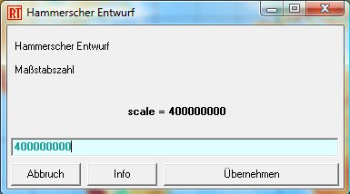 Nun führt das RTA-Programm einen kleinen Dialog. Es werden einige Parameter abgefragt, die von Programm zu Programm variieren können. (Beispielsweise wird ein Berührungskegelentwurf einen Berührungsparallel abfragen, ein Schnittkegel hingegen zwei Schnittparallelbreiten.) Natürlich wird jedes Programm einen Maßstab scale abfragen. Das ist die erste Frage des „Hammer“. Bitte die Maßstabszahl 400 Millionen eingeben: