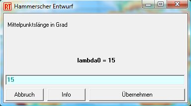 Unser Hammerscher Entwurf beitet den Service, dass die geographische Länge des Mittelmeridians frei gewählt werden kann. Hier bitte 15 eingeben: