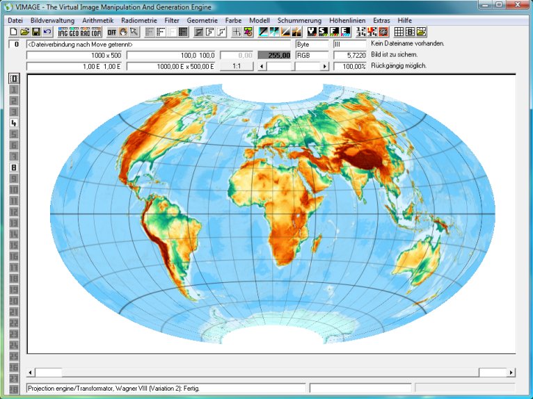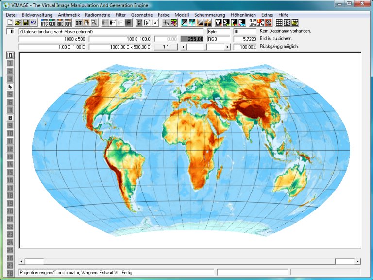 Natürlich kann Vimage auch viele andere Kartennetzentwürfe rechnen. Wie wäre es mit dem von Karlheinz Wagner entworfene, sehr eleganten Wagner VII?