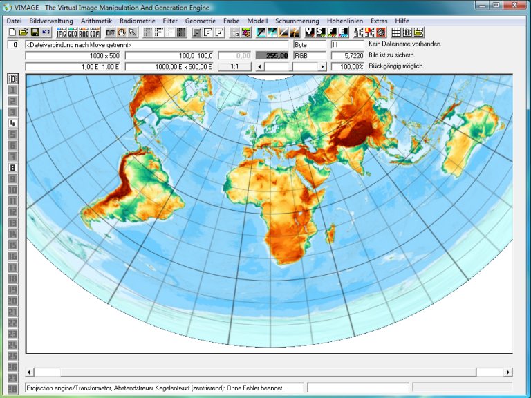 Der Kartenmaßstab ist eine ganz fundamentale Eigenschaft eines Kartennetzentwurfes. Im Rasterbild kann es aber nur einen Maßstab geben, wenn eine feste Pixelgröße (oder Auflösung) festgelegt ist. Aus diesem Grund gibt es beim Rechnen von Kartennetzen mit Vimage eine fundamentale Grundregel: Kartennetzentwürfe werden immer in der Standardauflösung 1 Pixel = 0,1 mm (100 dpcm oder 254 dpi) berechnet.
