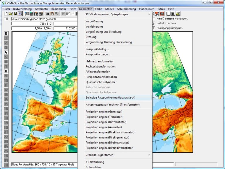 Die multiquadratische Interpolation nach Hardy (1971) ist wirklich ein ganz genialisches Verfahren, um Passpunkttransformationen mit theoretisch unendlich vielen Punkten zu realisieren. Vimage ist dafür ausgelegt, bis zu 200 Passpunkte zur Deckung bringen. Eingebbar sind sogar bis 1200 Passpunkte.
