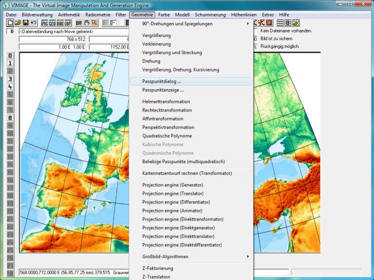 Bild öffnen und am besten Vergrößerung 200 % einstellen. Dann wird die Passpunktdialogfenster wird über das Menü Geometrie/Passpunktdialog erreicht.