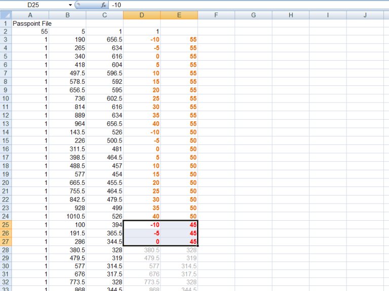 Ab der 3. Zeile folgen die Passpunktpaare. In der 2. und 3. Spalte stehen die Passpunktkoordinaten. Diese nicht ändern. In der 4. und 5. Spalte stehen die Basispunktkoordinaten. Diese haben zunächst noch dieselben Werte wie die Passpunkte (graue Schrift). Das ist auf die Kopie der Passpunkte in die Basispunkte zurückzuführen. Nun müssen die Basispunkte, so wie braun/rot dargestellt, geändert werden. Anschließend wieder als „Text (Tabstopps getrennt) (*.txt)“ als .pas-Datei speichern.