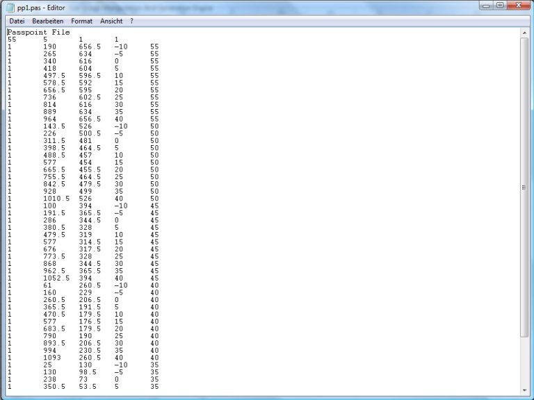 Die *.pas-Datei ist eine gewöhnliche Textdatei. Wichtig ist, dass die erste Zeile eine Kommentarzeile ist und auf der 2. Zeile die 4 Zahlenwerte [Passpunktanzahl], 5, 1 und 1 stehen. Ab Zeile 3 folgen die Koordinaten der Passpunktpaare. Die Datei lässt sich problemlos mit der Vimage-Funktion Passpunktsatz laden in den Vimage-Passpunktsatz übernehmen: