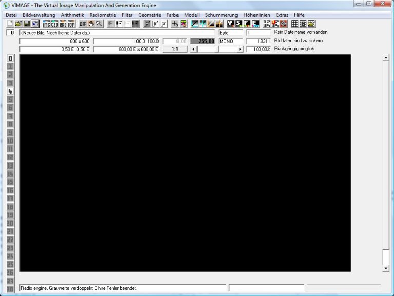 Vimage nutzt RTA außer, um Kartennetzentwürfe zu rechnen, auch für Grauwerttransformationen. Dies erfolgt mit der über das Radiometriemenü aufrufbaren Radio engine. Weil sich die Radio engine besonders einfach bedienen lässt, ist sie für den Einstieg in Vimage/RTA ideal geeignet.
