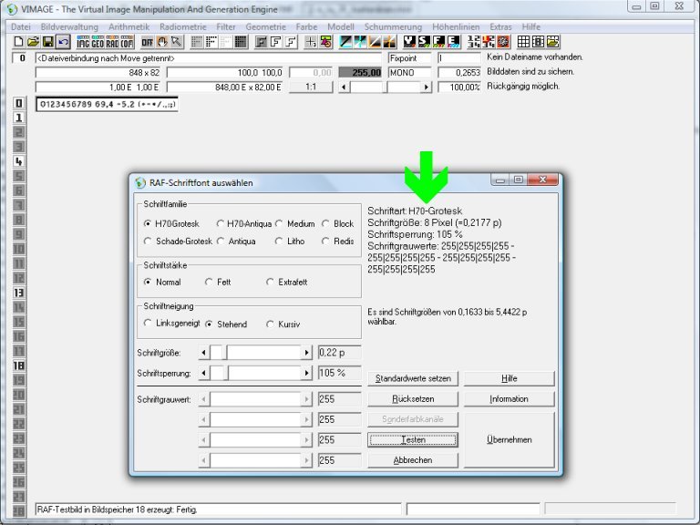 Man wähle Höhenlinien/Höhenlinienzahlen auswählen. Es erscheint das Dialogfenster RAF-Schriftfont auswählen. Durch Anklicken der Taste „Testen“ wird ein Beispielsatz erzeugt.