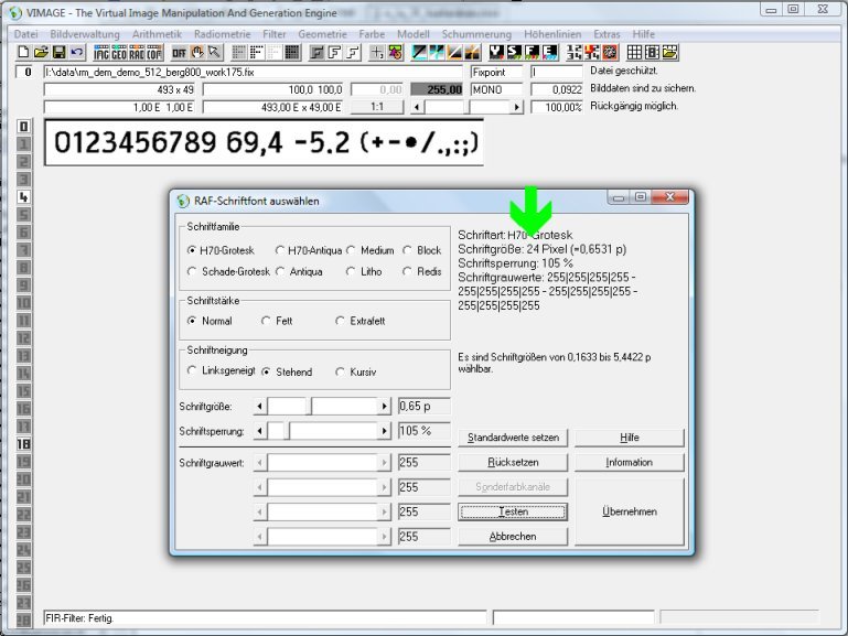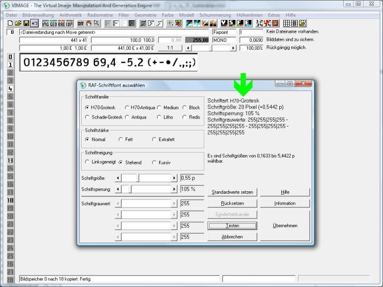 Die Größe wird in Pixel Zifferngröße angegeben (in älteren Ausgaben von Vimage auch in Punkten). Dies wird unter dem grünen Pfeil angezeigt: Hier beträgt die Schriftgröße 20 Pixel Ziffernhöhe.