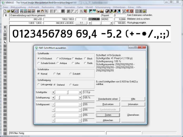 Vimage ist angetreten, Höhenlinienzahlen in herausragender Qualität vollautomatisch zu positionieren und zu setzen. Weil hierfür viele Parameter der Ziffernzeichen ganz exakt bekannt sein müssen, ist dies mit Truetypeschriften schwierig. Darum benutzt Vimage eigene Schriftarten, die auf einer skalierbaren Rasterdefinition beruhen, sog. Raster-Fonts oder RAF-Fonts ein. Diese erlauben zugleich einen gut lesbaren Satz in sehr kleinen Schriftgrößen.