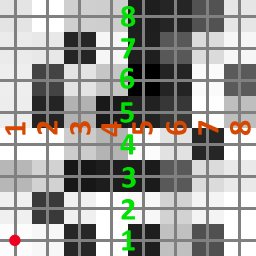Das linke untere Eckpixel hat Bildkoordinate (1, 1). Bildkoordinaten sind ganzzahlig, jedes Pixel zählt um Eins weiter. Das rechte obere Eckpixel hat die Bildkoordinate ([Spaltenzahl], [Zeilenzahl]).