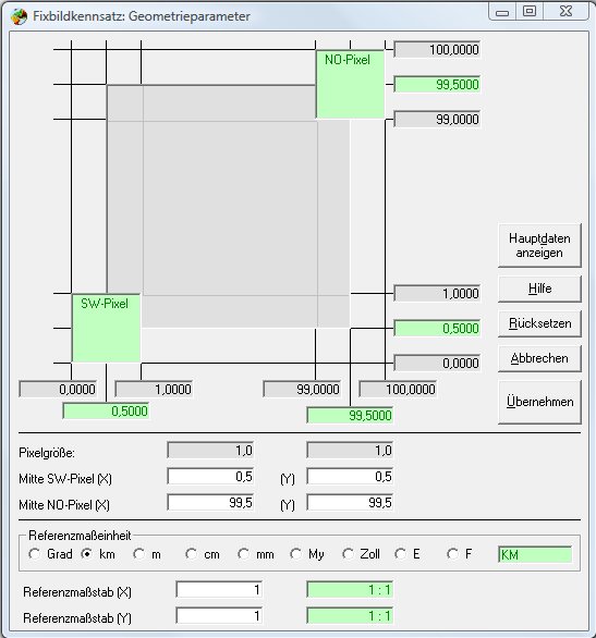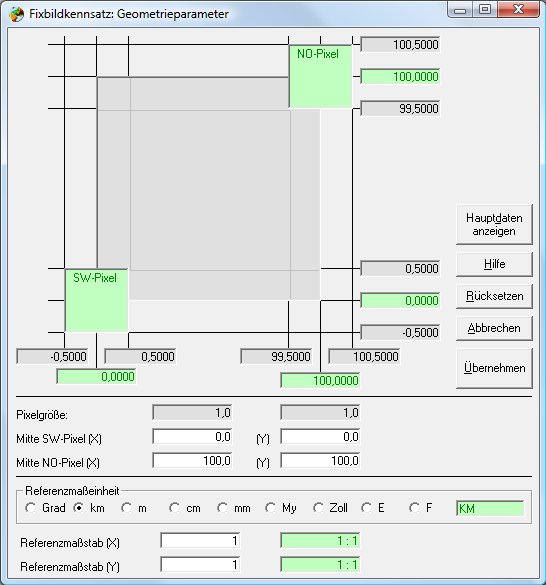 rechnet exakt mit Pixelbruchteilen und unterstützt damit beide Verortungsarten. Allerdings muss die Verortungsart beachtet und richtig eingestellt werden. Der Übergang zwischen beiden Verortungsarten erfolgt einfach durch einen Versatz von 1/2 Pixel der unter Bildverwaltungsmenü/Geometrieparameter eingestellt werden kann:
